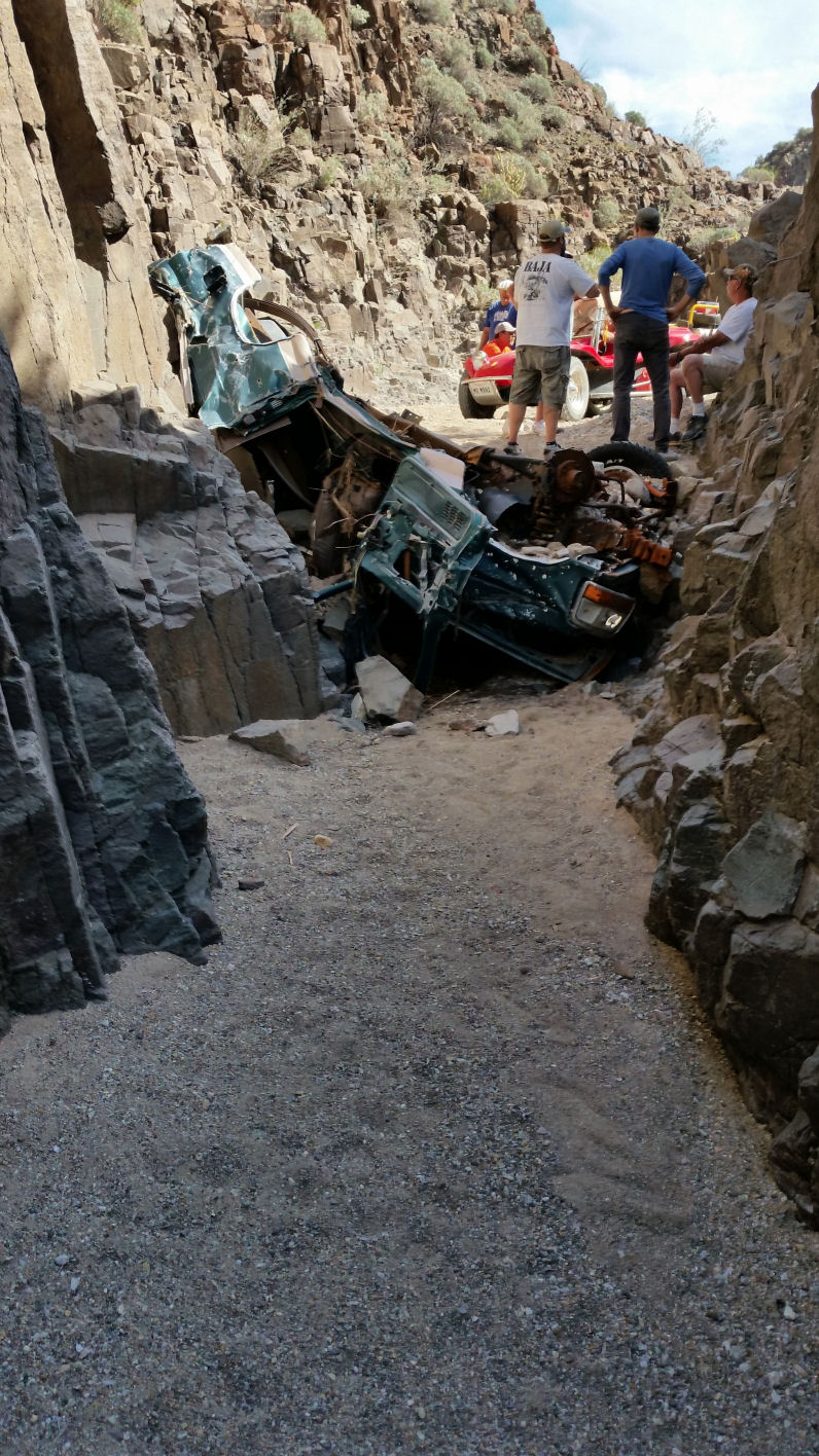 Derelict Bronco buried in the sand and wedged between the cliff faces.